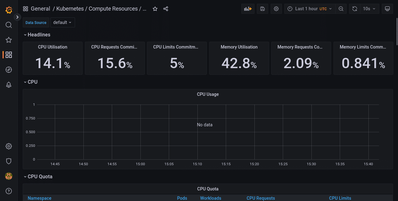 This dashboard shows the resource requests, limits, quotas, and utilization for individual Pods. You can select the namespace and Pod to view from the dropdowns at the top of the screen.