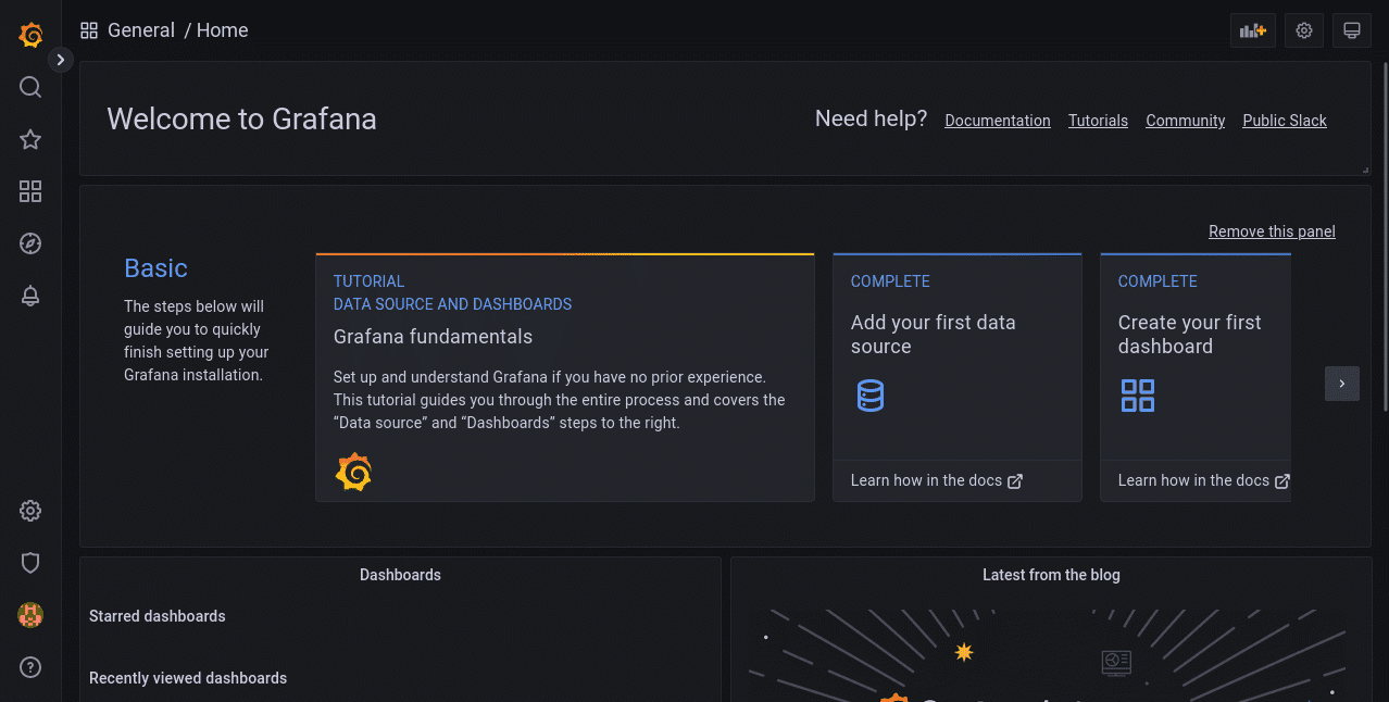 After you’ve logged in, you’ll initially reach the Grafana welcome screen: