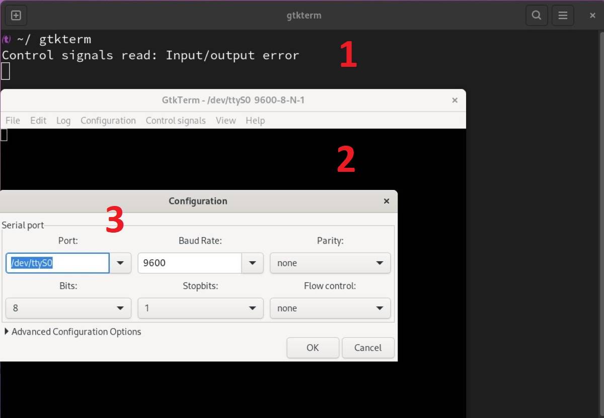 paru -S gtktermWhen you launch the app, you’ll have to set the device name and speed parameters via the Configuration > Port menu as follows: